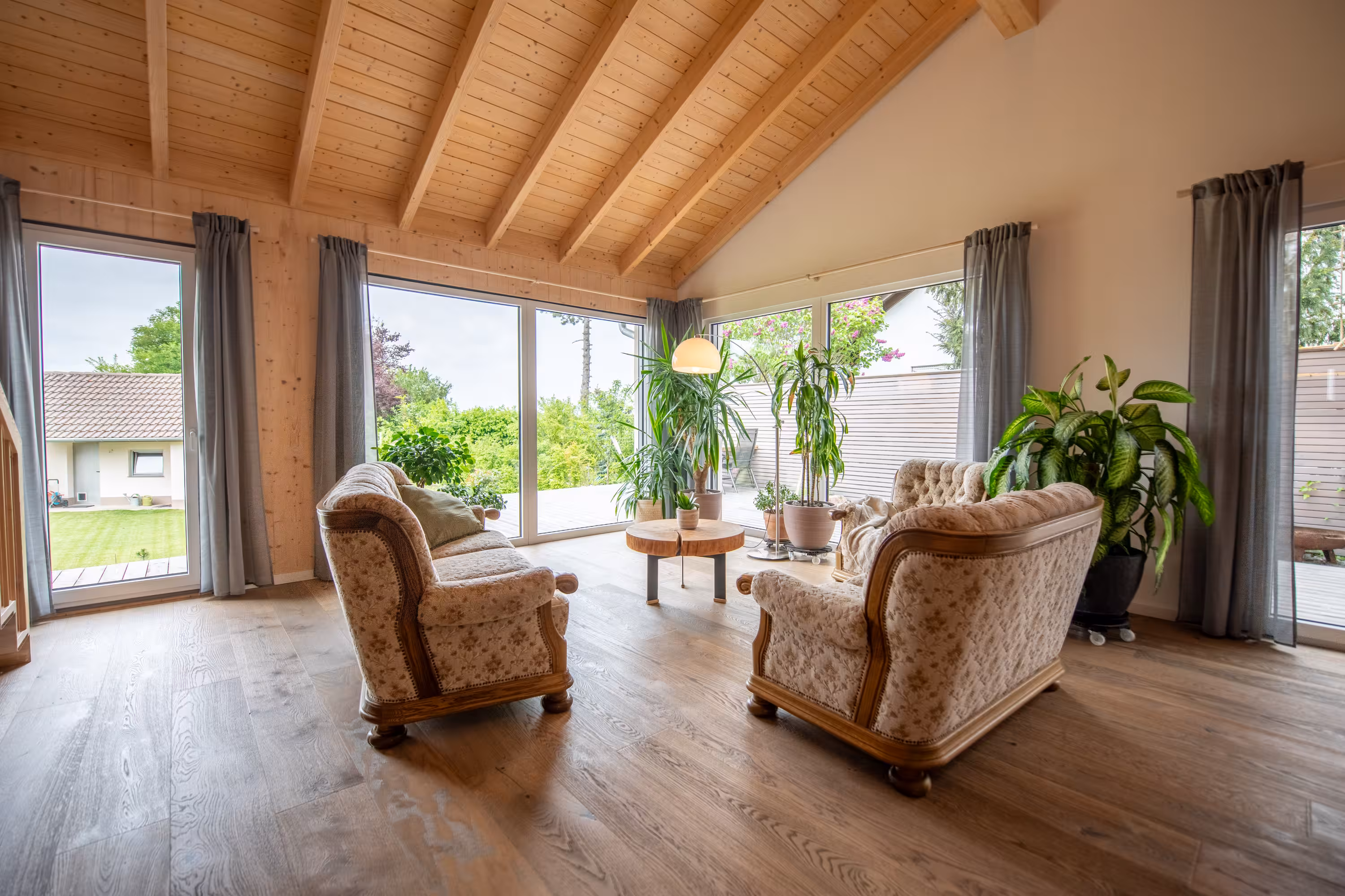 Grundsätzlich werden Massivholz-Konstruktionen ohne Dampfsperren und Windbremsen ausgeführt. Wände, Decken und Dach sind diffusionsoffen.